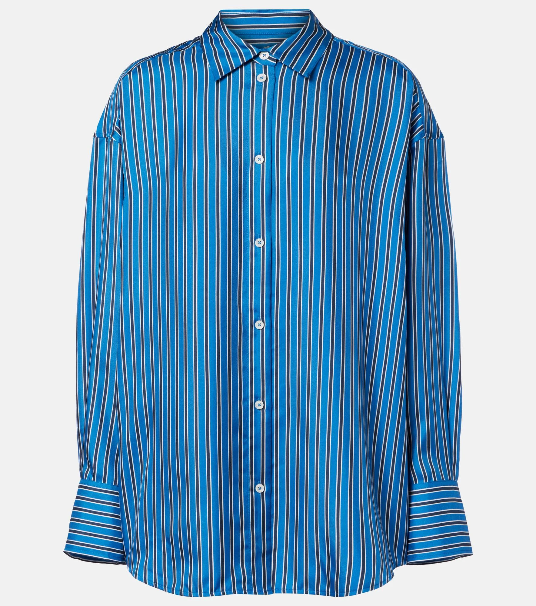 Define your dress code with styles from Toteme, a Stockholm-based brand dedicated to creating a modern uniform. This classic shirt is crafted from pure silk in a vibrant hue and finished with a striped print. Product Details - Material: 100% silk - Care instructions: dry clean - Made in China - Color: blue - Designer color name: Blue/Navy - Closure: buttoned front - Collar: classic (Straight point) - Item number: P01136617 Size & Fit - True to size - For a closer fit, we recommend taking one size down - Oversized - Non-stretchy fabric - Falls below the hip - The model seen in the picture is 178cm-5'10" and wearing a size DE 34