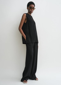 TOTEME top treated to create raised stripes infused with an artisanal mood. Woven from a fluid viscose blend with a hint of fresh linen, it has a round neck and a longline silhouette complete with side-hem slits and a concealed back zipper. Wear it as a set with the matching trousers. Details & Fit - Black - Side-hem slits - Concealed back zipper - 96% viscose, 4% linen - Cool hand wash - Style number 252-WRT0508-FB0192 - The model is 178cm/510 tall and wears a size 36 - True to size