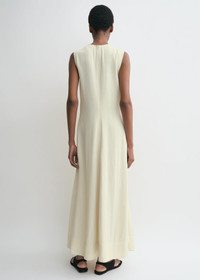 Long TOTEME dress treated with raised stripes infused with an artisanal mood. Woven from a fluid viscose blend with a hint of fresh linen, it has practical pockets and a concealed back zipper. Complement the generously flared skirt with flat sandals. Details & Fit - Ecru - Side slip pockets - Concealed back zipper - 96% viscose, 4% linen - Cool hand wash - Style number 252-WRD0182-FB0192 - The model is 178cm/510 tall and wears a size 36 - True to size