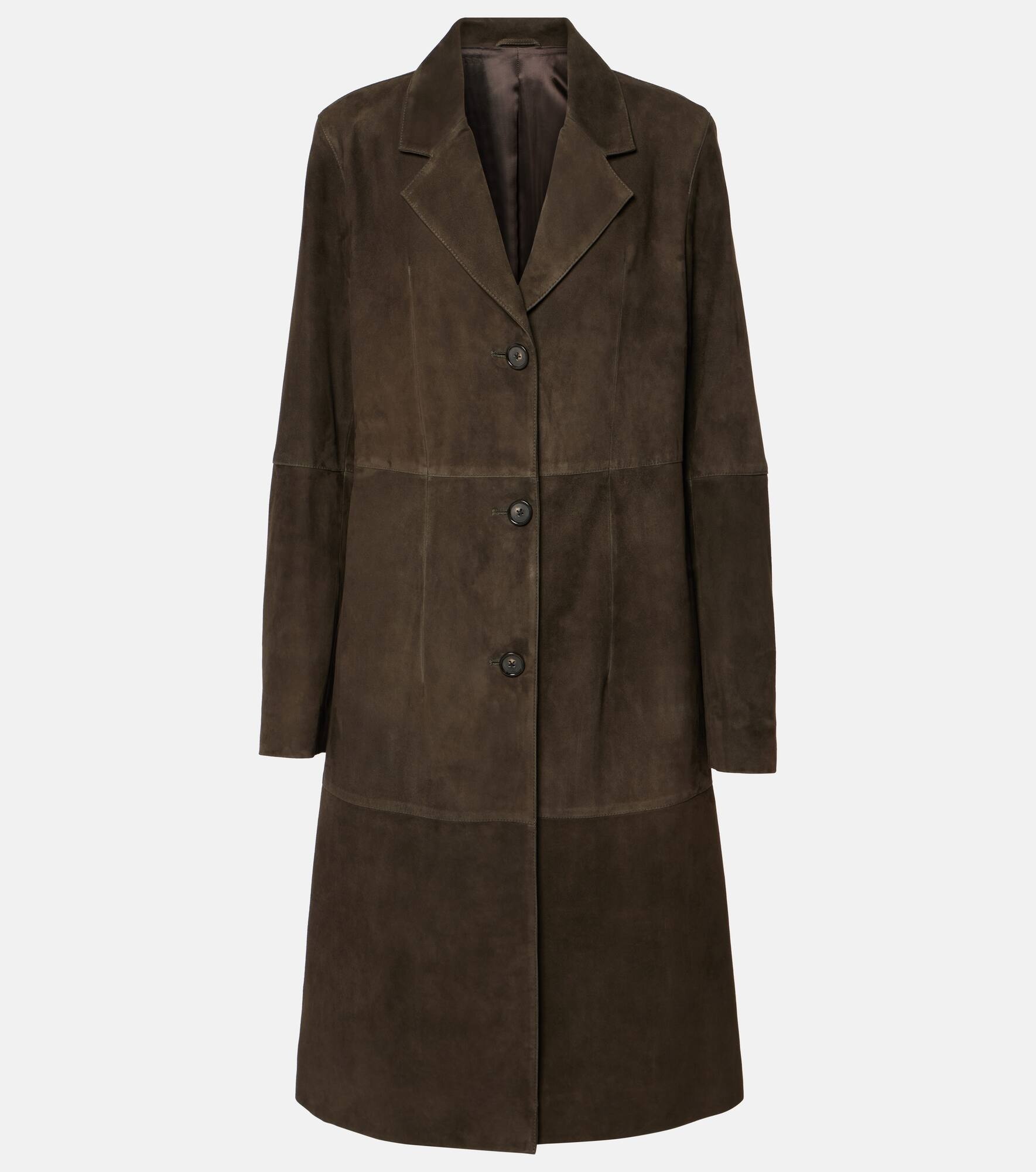 Characterized by immaculate lines and expert craft, this coat conveys Toteme's vision of minimalism. It's made from panels of supple suede with a buttoned front and a slightly cinched waistline for an elegant fit. Product Details - Material: 100% leather - Care instructions: specialist clean - Made in Turkey - Designer color name: Pepper - Lining: 100% viscose - Closure: double-breasted buttoned front - Pockets: slant pockets - Item number: P01040586 Size & Fit - True to size - Cinched waist - Non-stretchy fabric - The model seen in the picture is 178cm-5'10" and wearing a size DT 34