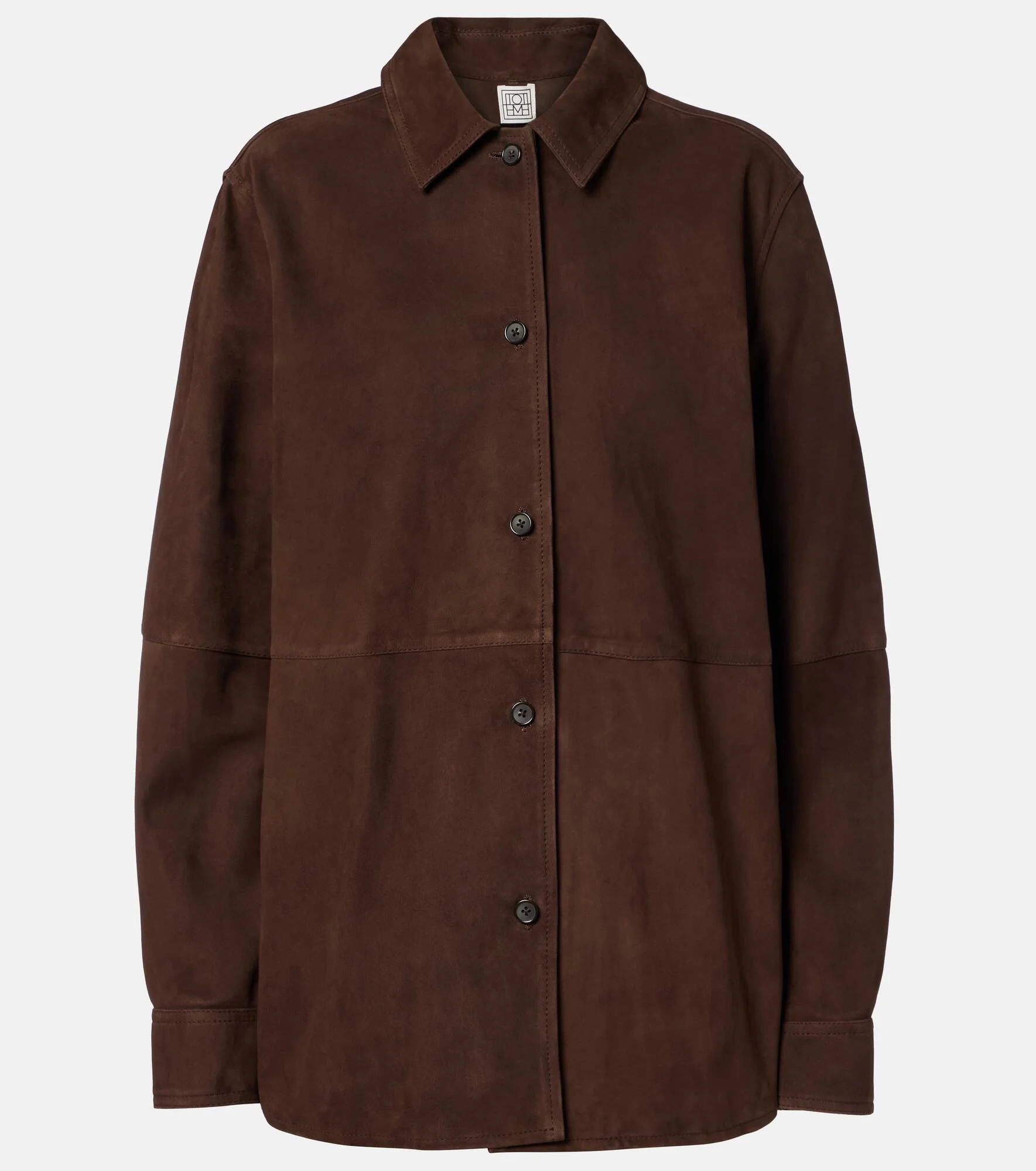 Define your dress code with styles from Toteme, a Stockholm-based brand dedicated to creating a modern uniform. This chic overshirt is cut from pure suede. Product Details - Material: 100% lamb leather (suede) - Care instructions: specialist clean - Made in Turkey - Color: brown - Designer color name: Bark - Closure: buttoned front - Cuff: buttoned - Item number: P01136620 Size & Fit - True to size - Shoulder pad inserts - Designed for a loose fit - Non-stretchy fabric - Falls below the hip - The model seen in the picture is 178cm-5'10" and wearing a size DE 34