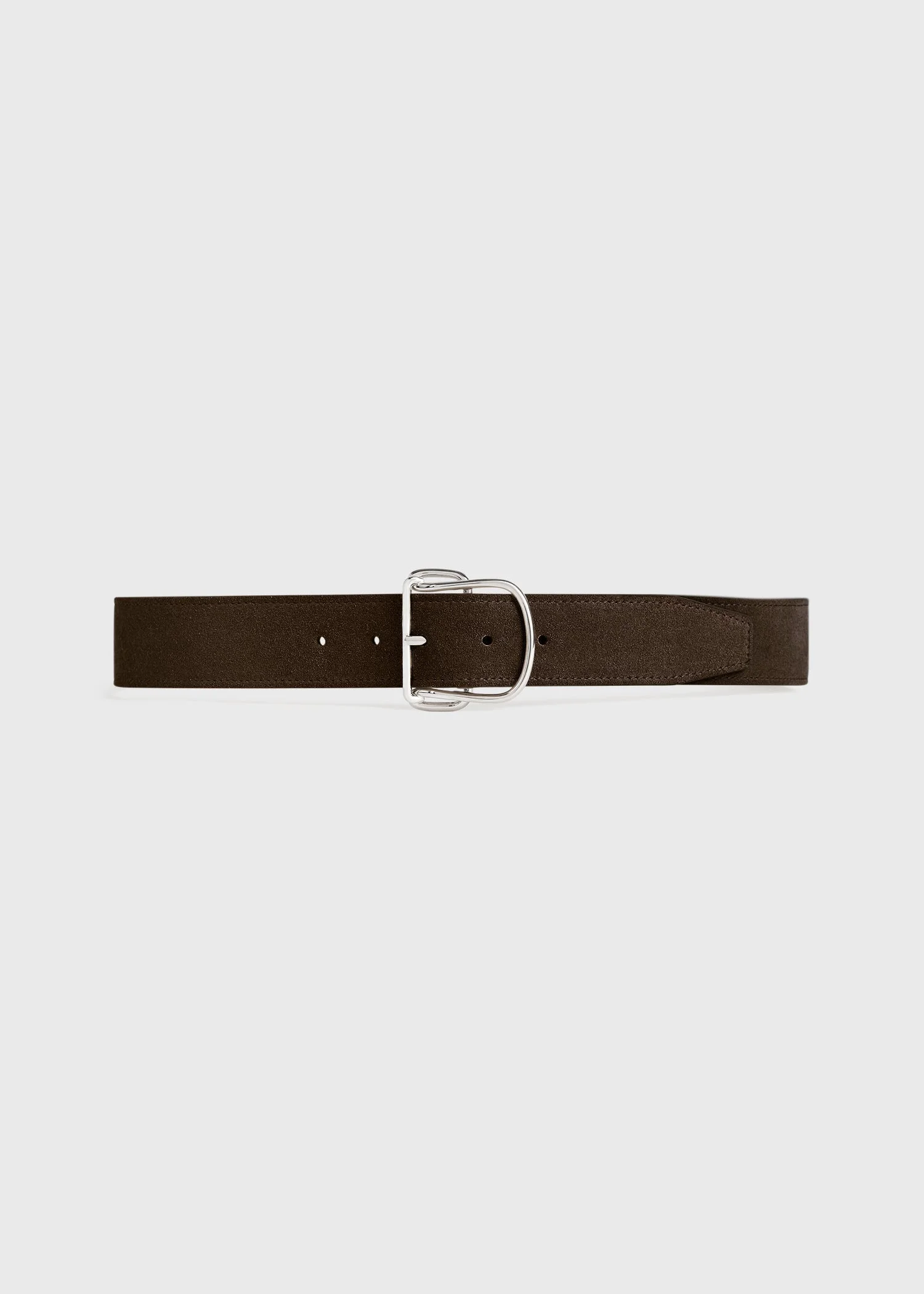 New TOTEME belt set with a sculptural silver-tone buckle inspired by the intertwining shapes of our Swirl jewelry pieces. It is Italian-crafted from suede to a 4cm width devised to complement statement looks. Let it stand out against black separates. Details & Fit - Pepper - Silver-tone metal buckle - Leather lining - 100% cow leather - Care instructions and dust bag included - Style number 252-WAM0046-LE0004 - Length 70cm/27, 80cm/31 or 90cm/35 (measured from buckle base to middle hole) Width 4cm/1.6"