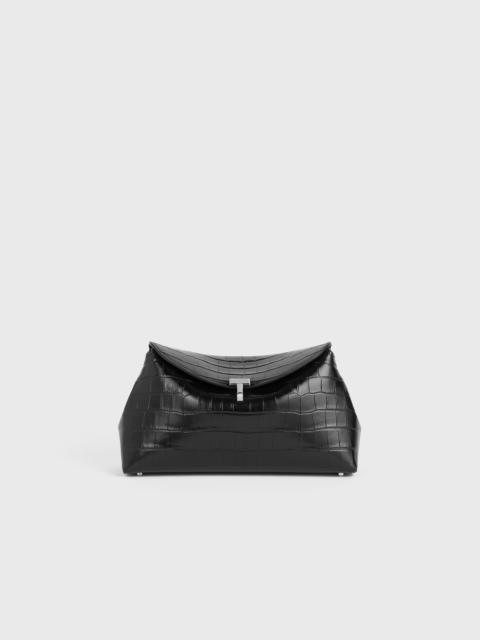 Sculptural TOTEME clutch bag named T-Lock after the silver-tone metal twist lock securing the curved top flap. It is crafted in Italy from crocodile-effect leather and fitted with an internal card slot. Hold it in your hand or carry it across the body using the optional strap. Details & Fit - Black croco - Detachable, adjustable strap (must be attached with the clasp opening facing inwards) - Silver-tone twist lock - Microsuede lining, internal card slot - 100% cow leather; lining: 60% polyurethane, 40% polyamide - Care instructions and dust bag included - Style number 243-WAL944-LE0076 - Strap drop length: adjustable (45cm/17.8" on middle hole) - Height 14cm/5.5" - Width 26cm/10.2" - Depth 9cm/3.5" - Strap drop length: adjustable (45cm/17.8" on middle hole) - Height 14cm/5.5" - Width 26cm/10.2" - Depth 9cm/3.5"