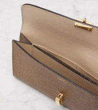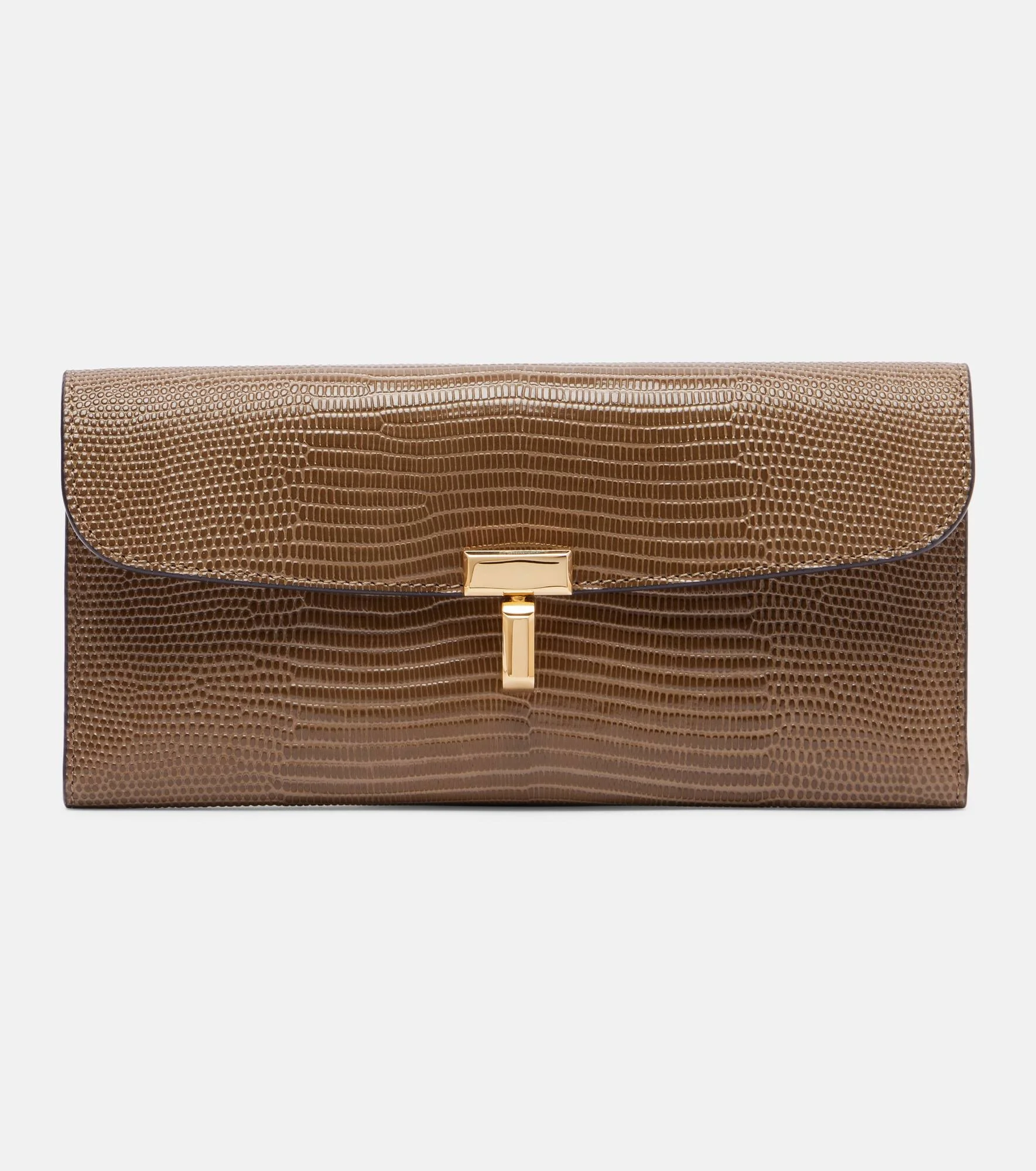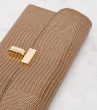 The T-Lock wallet by Toteme is defined by the brand's signature gold-toned geometric clasp at the front. Crafted from leather embossed with a lizard pattern, this sleek silhouette features a bold yet minimal design. Product Details - Material: leather - Lining: leather - Made in Spain - Designer color name: Dark Olive - Item color: green - Internal details: Card slots, three internal compartments - Closure: turn-lock fastening - Includes: box - Item number: P01023956 Size & Fit - Height 9,5cm-3.5" - Width 20cm-8" - Depth 1cm-0.5"
