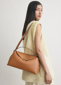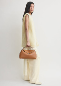 Everyday TOTEME bag outlined with a curved flap that complements the shape of the arm. It is crafted in Italy from softly textured Palmellato leather with a metal T-Lock and two internal slip pockets. Carry it from the top handle or the detachable and adjustable strap for different styling options. Details & Fit - Camel - Detachable, adjustable strap (must be attached with the clasp opening facing inwards) - Gold-tone twist lock - Microsuede lining, internal slip pockets - 100% cow leather; lining: 60% polyamide, 40% polyurethane - Care instructions and dust bag included - Style number 234-WAL956-LE0025 - Strap drop length: adjustable (45cm/17.8" on middle hole) - Top handle drop 18cm/7.1'' - Height 17cm/6.7'' - Width 35cm/13.7'' - Depth 12/4.7''