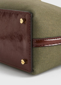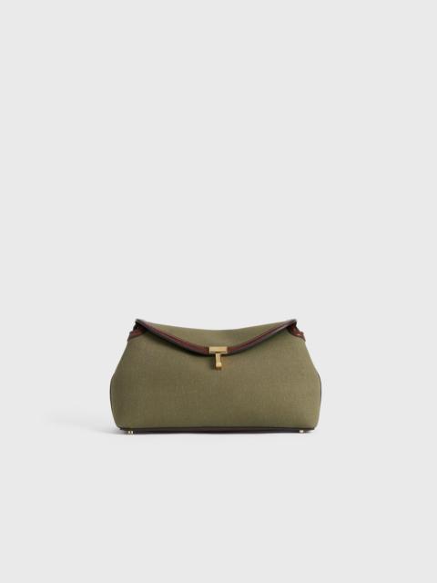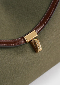 Sculptural TOTEME clutch bag named T-Lock after the gold-tone metal twist lock securing the curved top flap. It is crafted in Italy from canvas finished with oxblood-red Naplack leather and fitted with an internal card slot. Hold it in your hand or carry it across the body using the optional strap. Details & Fit - Khaki green - Gold-tone metal hardware, oxblood-red leather trims - Microfiber interior, leather slip pockets - 44% cotton, 44% linen, 12% acrylic; trims: 100% cow leather; lining: 60% polyamide, 40% polyurethane - Care instructions and dust bag included - Style number 243-WAL961-FB0234 - Strap drop length adjustable (44cm/17.3" on middle hole) - Height 14cm/5.5" - Width 26cm/10.2" - Depth 9cm/3.5"