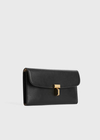 TOTEME's T-lock family is expanding into small leather goods, including this elegant continental wallet. It is crafted from softly textured palmellato leather set with a metal clasp and fitted with multiple internal compartments, including six card slots. Details - Black - Gold-tone metal T-Lock clasp - Black leather interior - Three internal compartments, six card slots - 100% cow leather - Care instructions included - Style number 251-WAM0041-LE0025 Fit information - Width 20cm/8" - Height 9.5cm/3.7" - Depth 2cm/0.8" Origin & Certificates - Country of origin:Spain - Manufacturer: Pinavall SL