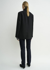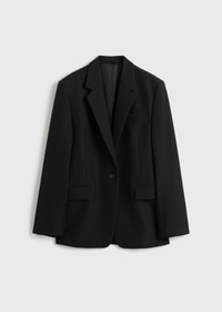 Designer’s note: “This TOTEME blazer from the Garderob curation is rooted in masculine tailoring. It's thoughtfully crafted from our signature suiting fabric to an oversized silhouette fastened with a single front button for minimalist appeal. Slip a scarf inside the wide lapels as a casual nod to black-tie dressing.” Details & Fit - Black - Button front - Flap pockets - Satin lining, internal pocket - Light suiting fabric with a subtle grain - 55% polyester recycled, 45% wool RWS - Dry clean - Style number 252-WRZ0049-FB0026 - The model is 181cm/511 tall and wears a size 36 - Oversized fit, wide shoulders