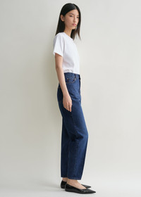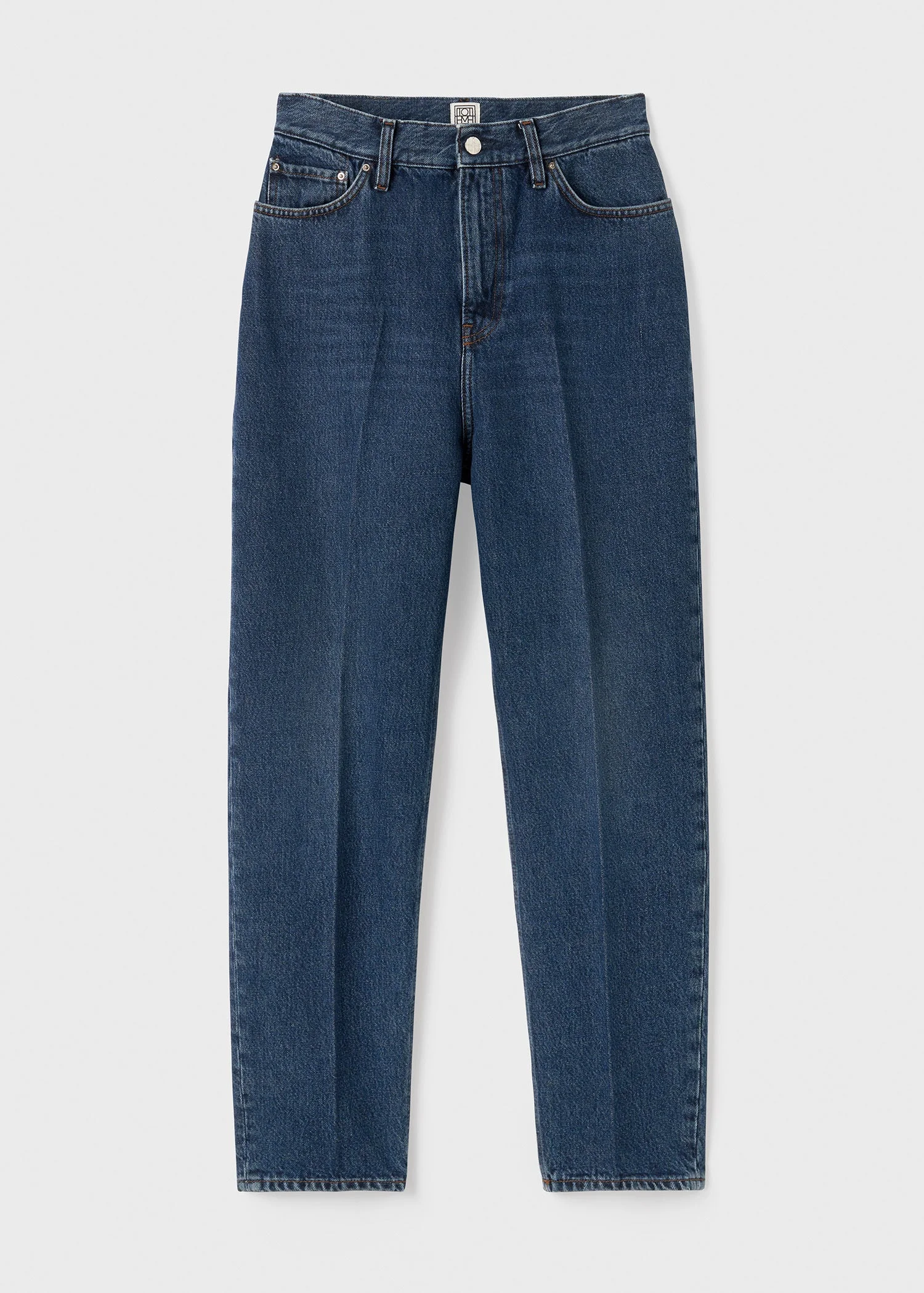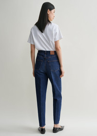TOTEME jeans inspired by tailored trousers with carrot-shaped tapered legs that fit loosely at the hips and thighs. They're made in Italy from structured organic-cotton denim that will mold to fit you perfectly over time, and have a mid waist with a zipper fly, five pockets, and a monogram-debossed leather patch. Add flats for a walk in the park or boots for a dinner date. Details & Fit - Dark blue - Zipper fly, silver-tone hardware - Belt loops, five pockets - Monogram leather patch - 100% Organic cotton - 30°C Machine wash - Style number 223-231-741 - Mid-waist, loose fit at hips and thighs - The model is 177cm/59 tall and wears a size 26/34 - Relaxed fit on the hips, consider taking a size down