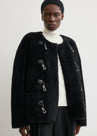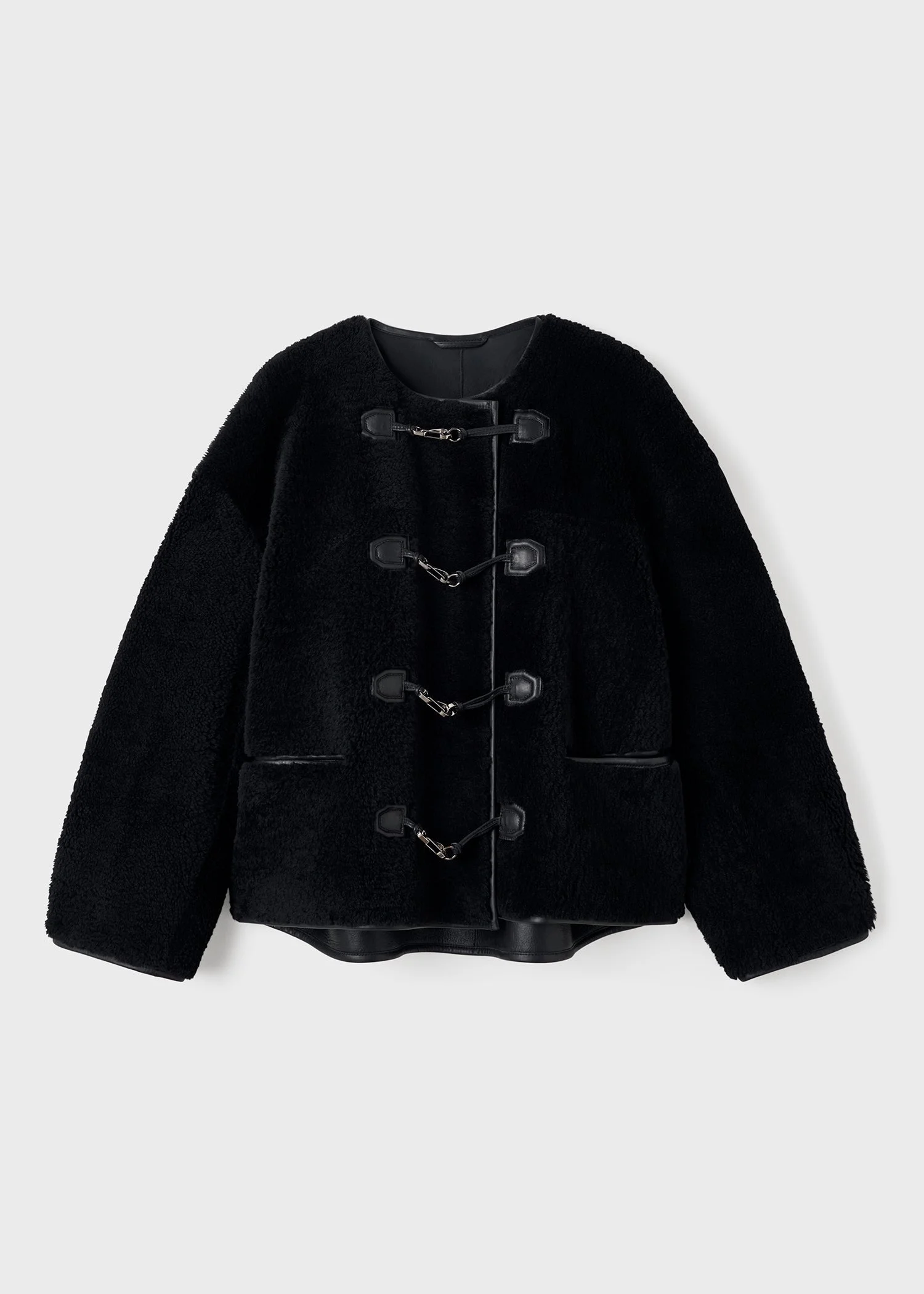 TOTEME winter jacket made from mid-weight, soft and warm teddy shearling with a supple leather interior matching the pockets and trims. It has a wide torso and arms resulting in a laid-back, oversized silhouette that fastens with silver-tone metal clasps. Wear it throughout the week as a cozy outerwear piece. Details & Fit - Black - Leather trims - Silver-tone metal clasps - Jet pockets - 100% Lamb shearling - Specialist clean - Style number 214-120-604 - The model is 179cm/510 tall and wears a size XS/S - Oversized fit, go down one or two sizes for a neater fit