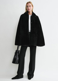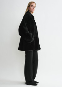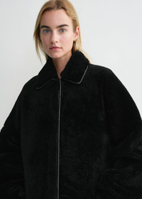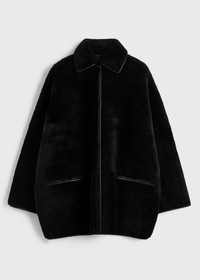 Overshirt-inspired TOTEME jacket cut to an extra oversized silhouette with wide sleeves for dramatic effect. It is made from heavyweight and extra-soft teddy shearling accented with leather trims, concealed snap buttons and slip pockets. Leave it open to show glimpses of the leather interior. Details & Fit - Black - Leather trims and interior - Concealed snap-button front - Slip pockets - 100% lamb leather - Specialist clean - Style number 244-WRO0135-LE0080 - The model is 179cm/5'10" tall and wears a size 36 - Oversized fit, wide sleeves