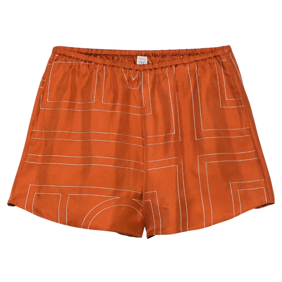 Shorts made from lightweight, fluid silk twill embroidered with a fine monogram pattern in contrasting ivory thread. They have a relaxed, straight-leg silhouette inspired by classic pajamas and are finished with an elasticated waistband and side pockets. - Terracotta - The position of the monogram pattern may differ from the pictures - Ivory embroidery - Elasticated waist - Side pockets - 100% silk