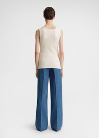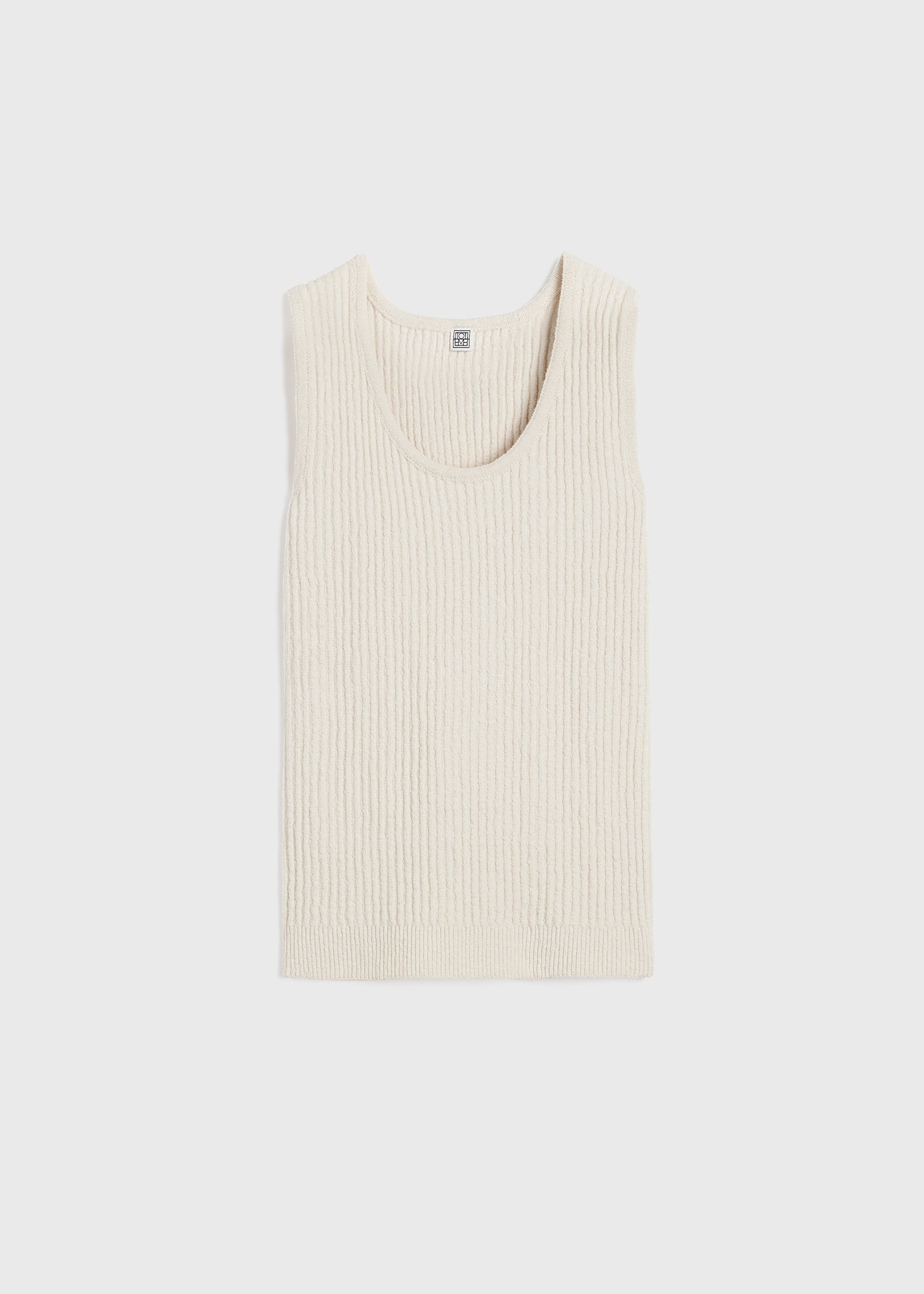 Slim TOTEME tank top conceived for cool summer evenings. It's knitted from mid-weight boucle with a chunky rib containing organic cotton fibers for a fresh sensation and can be worn with anything from an elegant skirt to jeans. Details & Fit - Ecru - 70% cotton organic, 30% polyamide - Cold hand wash - Style number 242-WRT1670-YA0042 - The model is 179cm/5'10" tall and wears a size S - Slim fit, true to size
