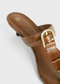 Flip-flop sandals reimagined with a gold-tone belt buckle engraved with an inconspicuous TOTEME. They're Italian-made from croco-embossed leather paired with a cushioned leather insole for comfort, then set on a 35mm kitten heel. Keep them in focus by wearing them with shorts and skirts. Details & Fit - Camel - Gold-tone metal buckle - Cushioned leather insole - Black leather sole 100% cow leather; sole: 100% calf leather - Care instructions and dust bag included - Style number 242-WAS2043-LE0023 - Average heel height 35mm/1.4" proportional to shoe size - True to size, narrow fit at the front