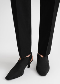 A hybrid between TOTEME's The Mid Heel Boot and The Sharp Slingback, these new 50mm heels are fit for anything from a social lunch to a dinner party. They're crafted in Italy from mesh-like elastic with suede at the back and are partially lined in smooth leather. Details & Fit - Black - Elastic upper - Suede slingback and heel - Leather heel counter and insole 80% polyester, 20% elastane; trim: 100% cow leather; lining: 100% sheep leather - Care instructions and dust bag included - Style number 242-WAS1419-FB0152 - Average heel height 50mm/2" proportional to shoe size - True to size, elastic construction