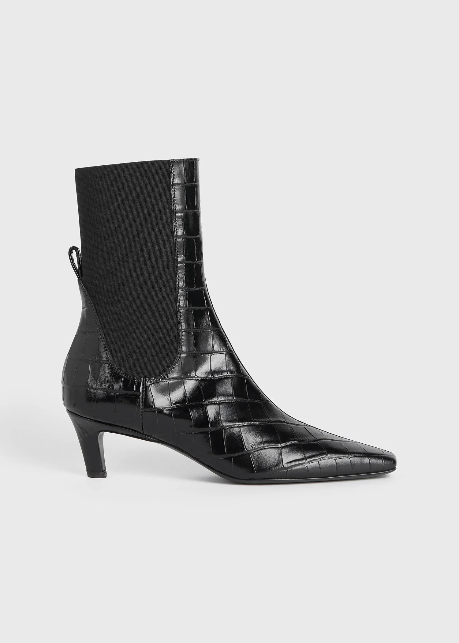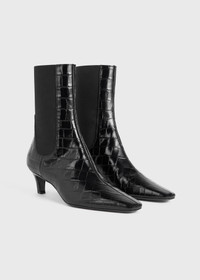 TOTEME ankle boots sculpted to a sleek silhouette led with a squared point toe and a slanted 50mm heel. They're made in Italy from crocodile-debossed leather with an elasticated panel that runs from the sides to the back, creating a partial sock-like fit. Wear them throughout the year with your favorite jeans. Details & Fit - Black croco - Leather lining - 100% Cow leather, lining: 100% sheep leather; sole: 100% cow leather - Care instructions and dust bag included - Style number 234-WLGSE300-LE0029 - Average heel height 50mm/2" proportional to shoe size - True to size, narrow fit at the front