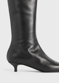 A knee-length style from TOTEME's boot offering, stitched up with a neatly paneled upper and set on a 35mm kitten heel. They are crafted in Italy from smooth Nappa leather with a foot-wrapping fit that is possible thanks to a handy side zipper. Let them peep below dresses and skirts. Details & Fit - Black - Side zipper - Leather lining - 100% calf leather; lining: 100% sheep leather; sole: 100% cow leather - Care instructions and dust bag included - Style number 244-WAS954-LE0014 - Average heel height 35mm/1.4" proportional to shoe size - True to size