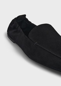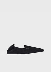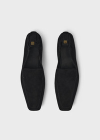 TOTEME travel loafers made in Italy from suede sourced from environmentally certified suppliers. They are shaped to a sleek silhouette with a signature squared toe, an elasticated back accented with a golden logo plaque at the pull tab, and supple leather lining. The foldable design makes them perfect for packing – take them on your next city break or staycation. Details and fit - Black - 100% calfskin leather - Narrow fit – if you have a wider foot, you may want to size up - Made in Italy - Care instructions included