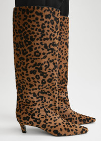 TOTEME boots named after their statement silhouette, which is outlined with a wide, tall shaft. They are crafted in Italy from calf leather treated with a tactile pony hair effect and printed with a bold leopard pattern, then are set on a covered 55mm heel. Keep them in focus by wearing them with knee-length dresses and skirts. Details & Fit - Leopard - Black and tan leopard print - Leather lining and sole - 100% calf leather; lining: 100% sheep leather - Care instructions and dust bag included - Style number 243-WAS3114-LE0070 - Average heel height 55mm/2.2" proportional to shoe size - True to size