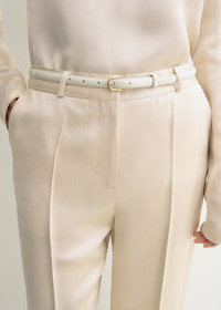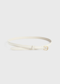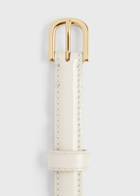 TOTEME's distinctive belt is shaped to a slim silhouette to fit smaller belt loops and fastens with a gold-tone metal buckle. It is made in Italy from responsibly sourced patent leather and comes in three different lengths. Style it with tailored trousers and jeans. Details & Fit - Bleached sand - Gold-tone metal buckle - Leather reverse - 100% calf leather - Care instructions and dust bag included - Length 70cm/27, 80cm/31 or 90cm/35 (measured from buckle base to middle hole) - Width 1.5cm/0.6" - Style number 244-WAM877-LE0091 - Length 70cm/27, 80cm/31 or 90cm/35 (measured from buckle base to middle hole) - Width 1.5cm/0.6"