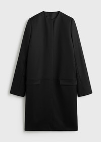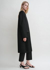 Collarless TOTEME coat designed with minimalist, clean lines for a purist appeal. It is crafted from structured chintz with a subtle sheen and has a concealed button placket, functional in-seam pockets and full lining. Channel the Summer 2025 collection's Scandinavian mood by styling it with black separates. Details & Fit - Black - Concealed button placket - In-seam pockets - Satin lining - 55% viscose, 43% cotton organic, 2% elastane; 100% viscose lining - Dry clean - Style number 252-WRO0208-FB0390 - The model is 178cm/510 tall and wears a size 36 - True to size