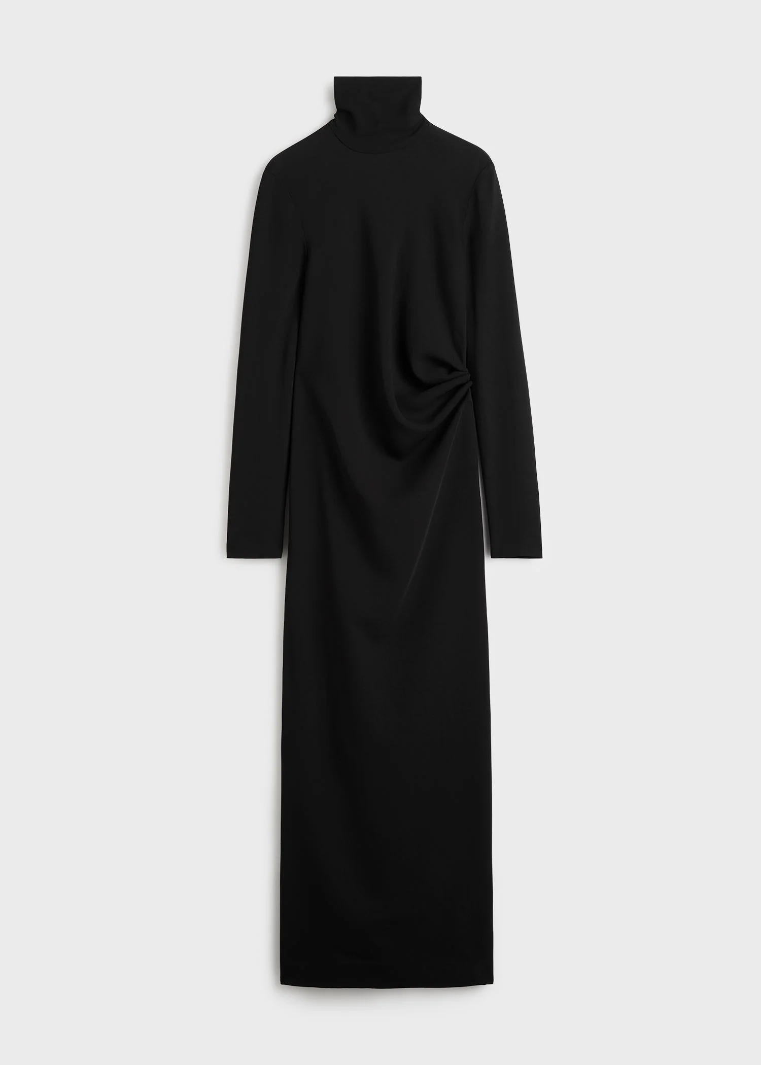 Long dress with a twisted silhouette and playful volume. The high-neck, long-sleeve silhouette loosely hugs the body and fastens with a concealed back zipper. Complement the fluid draping with a simple necklace. Details - Black - Concealed back zipper - 96% viscose, 4% elastane - Dry clean - Style number 261-WRD0368-FB0558 Fit information - The model is 178cm/5'10" tall and wears a size 36 - Slim waist, slightly elasticated fabric Origin & Certificates - Country of origin: Portugal - Manufacturer: Priority Season