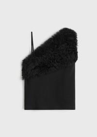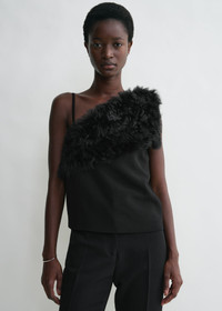 TOTEME slip-on top set with a curly shearling applique over an asymmetric neckline. It is made from mid-weight cady that is fully lined in satin for a clean finish. Tuck it into tonal trousers for a monochromatic look. Details & Fit - Black - Shearling applique - Satin lining - 93% viscose, 7% wool; trim: 100% lamb leather; lining: 100% viscose - Specialist clean - Style number 251-WRT4757-FB0331 - The model is 176cm/59 tall and wears a size 36 - True to size
