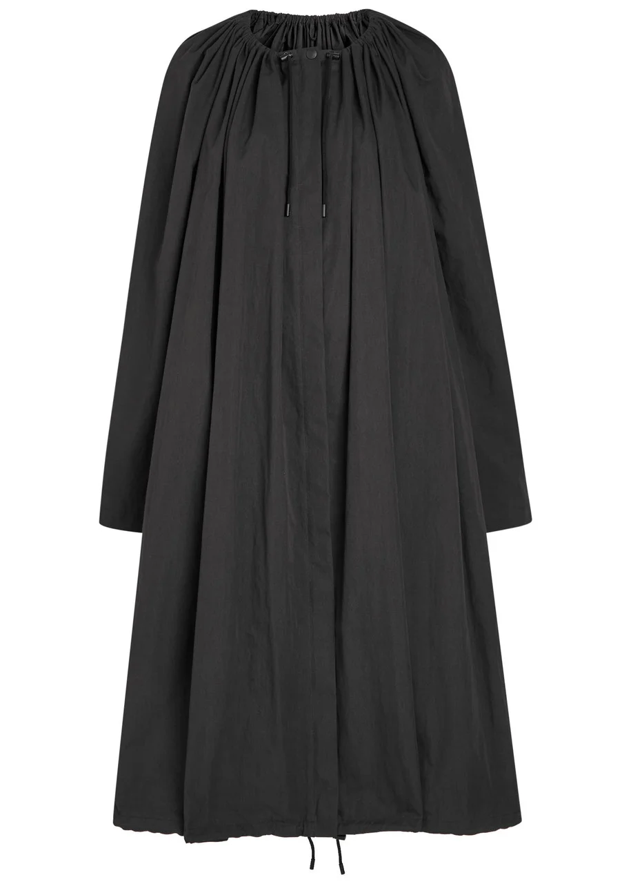 Info & Care Toteme cotton-poplin dress Toggle-fastening round-neck, press-stud embellished cuffs, toggle-fastening hem Partially concealed press-stud and zip fastening through front 74% organic cotton, 26% recycled polyamide Dry clean Size & Fit Length shoulder to hem: 46 inches/ 116.5cm Midweight Loose fit Model is 5'10"/ 178cm and wears a size small