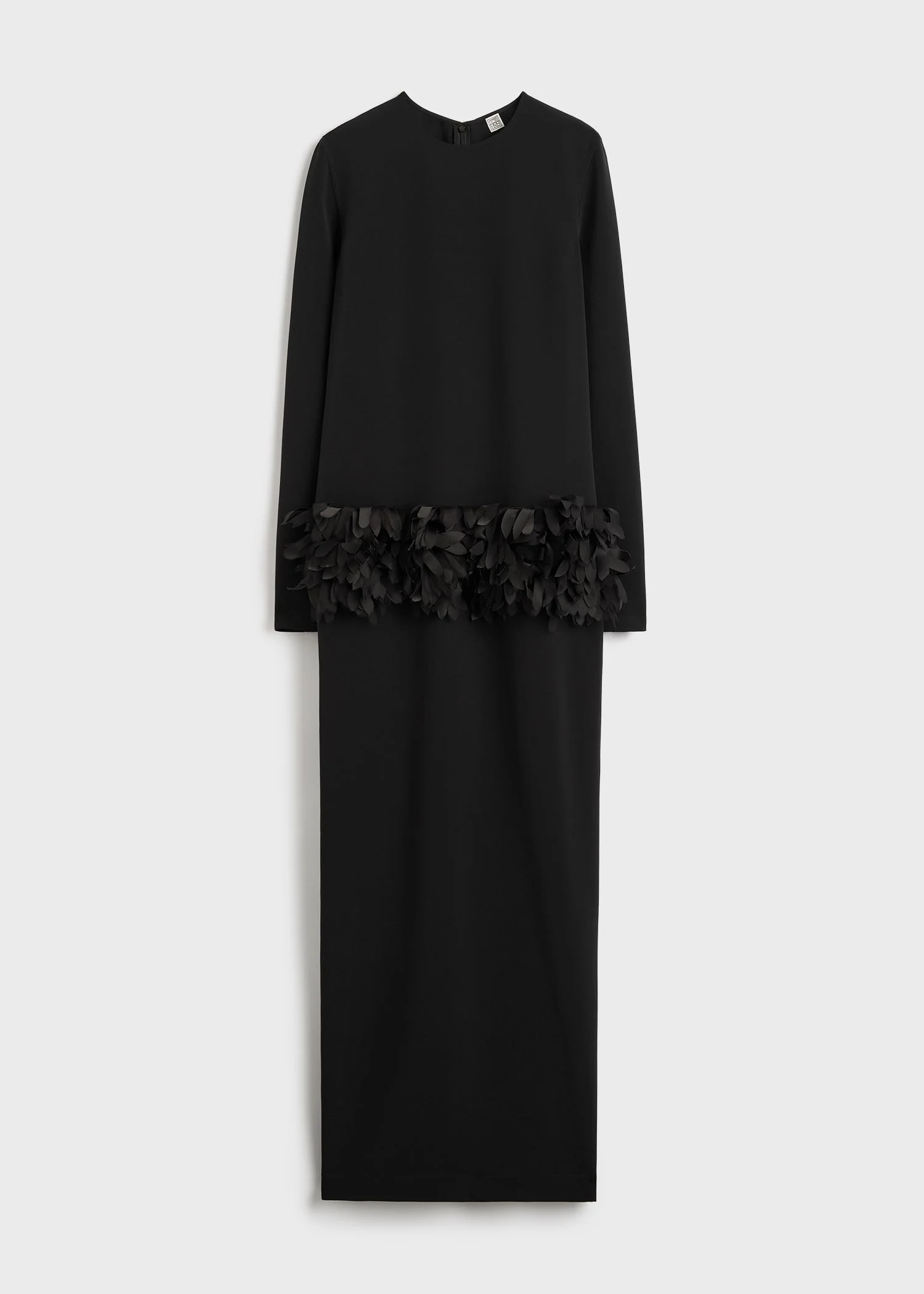 A standout piece from the Pre Spring collection, this occasion dress is decorated with fine petals that mimic the gentle sway of feathers. It has a precisely darted construction made from a structured wool-silk blend and fastens with a concealed back zipper. Complement the long, straight silhouette with a fine necklace. Details - Black - Attached petal panel - Concealed back zipper - 81% wool, 19% silk - Dry clean - Style number 261-WRD0278-FB0550 Fit information - The model is 180cm/5'11” tall and wears a size 36 - Straight fit, slim hips Origin & Certificates - Country of origin: China - Main supplier: Jiaxing Wenyuan Fashion Co, Ltd.