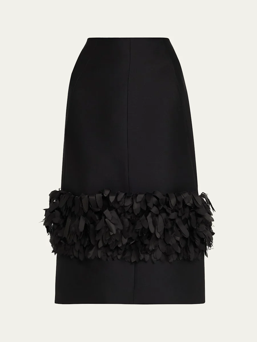 Toteme skirt is crafted from wool crepe accented with silk chiffon and satin petals embellished along the hem High waist Aline silhouette Hem falls below the knee Walking vent back Invisible back zip Wool/silk Dry clean Imported