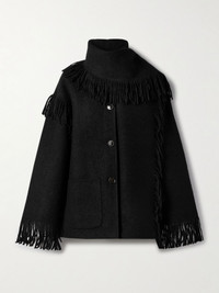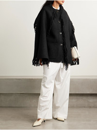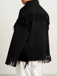 TOTEME's jacket has scarf-inspired panels that drape elegantly around your neck. Made from wool-blend, it's outlined with long fringing and has tortoiseshell-effect buttons for a touch of contrast. Size & Fit - Fits true to size, take your normal size - Intended for a slightly loose fit - Mid-weight, non-stretchy fabric with fringe trim - Model is 175cm/ 5'9" and is wearing a DK 38 Model measurements: - Bust: 79cm/ 31” - Waist: 61cm/ 24” - Hip: 88cm/ 34.5” Details & Care - Black wool-blend - Button fastenings through front - 88% wool, 12% polyester - Dry clean