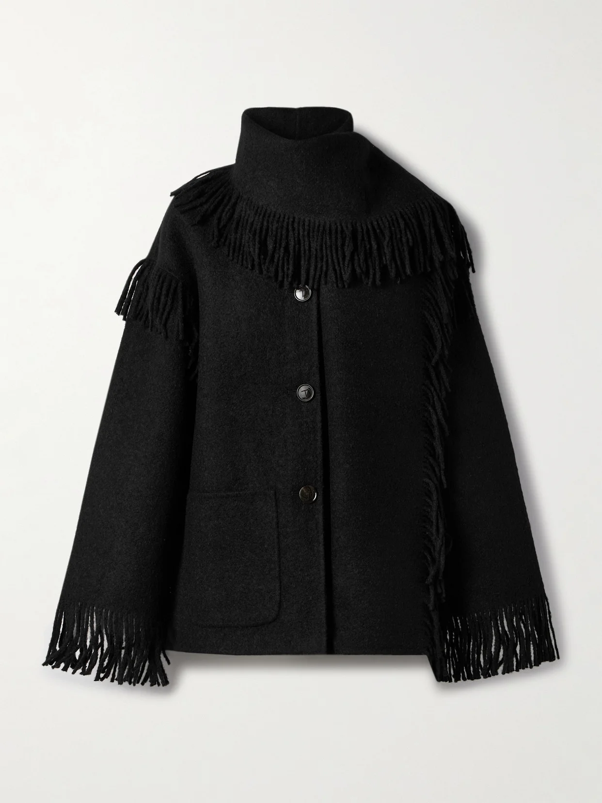 TOTEME's jacket has scarf-inspired panels that drape elegantly around your neck. Made from wool-blend, it's outlined with long fringing and has tortoiseshell-effect buttons for a touch of contrast.