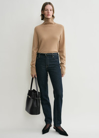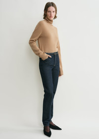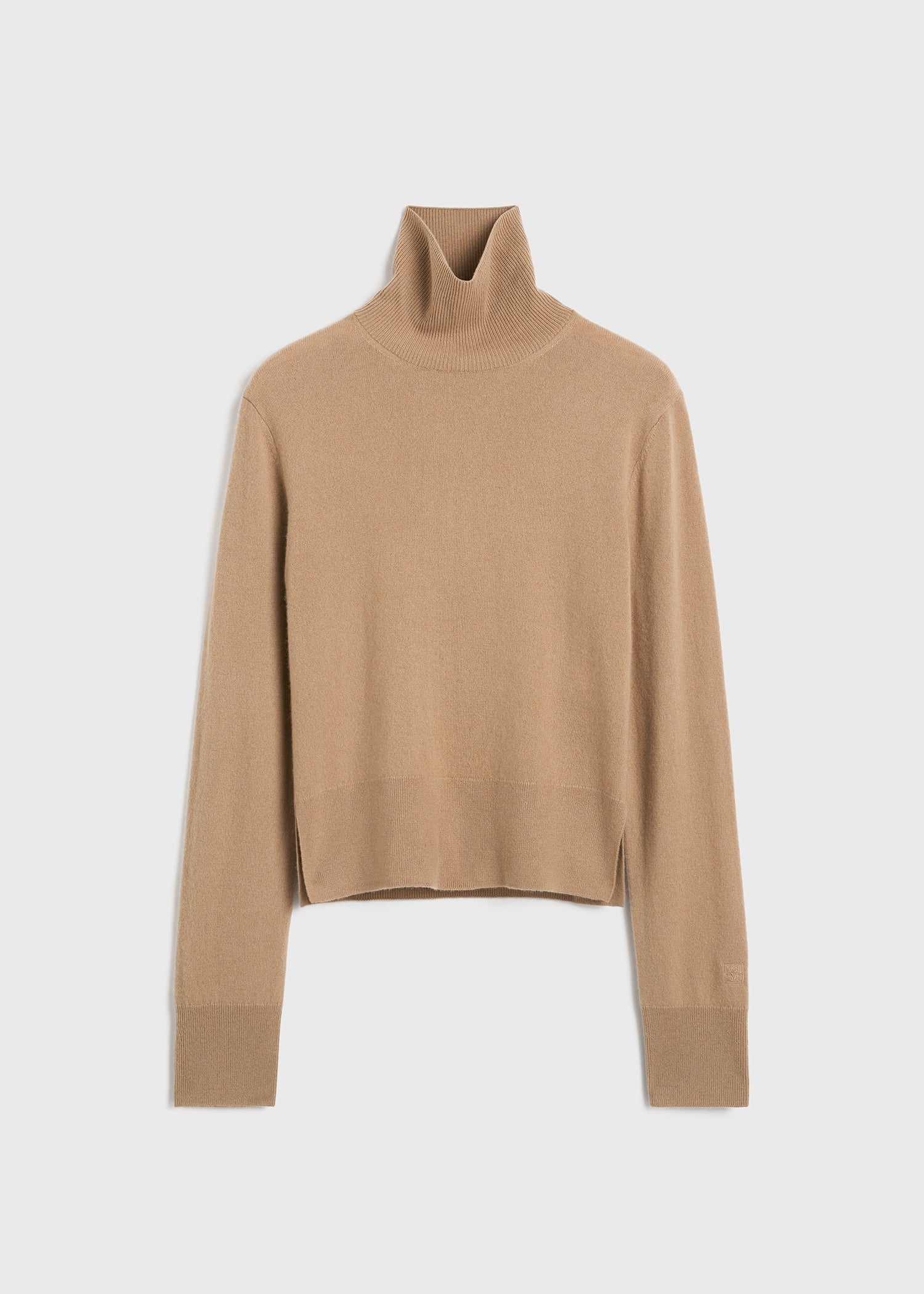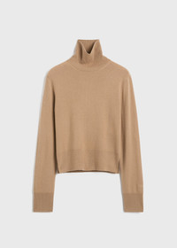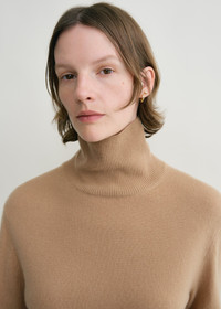 TOTEME turtleneck sweater presented in a cropped, petite silhouette as a new take on our wardrobe staples. It is knitted from light cashmere with ribbed edges and has a discreet monogram on the sleeve and side hem slits for an impeccable drape. Team it with jeans to see a movie. Details & Fit - Camel - Extra-long sleeves, embroidered monogram - Cropped hem, side slits - Ribbed edges - 100% cashmere - Cool hand wash - Style number 244-WRT0405-YA0016 - The model is 178cm/510 tall and wears a size S - True to size, petite fit