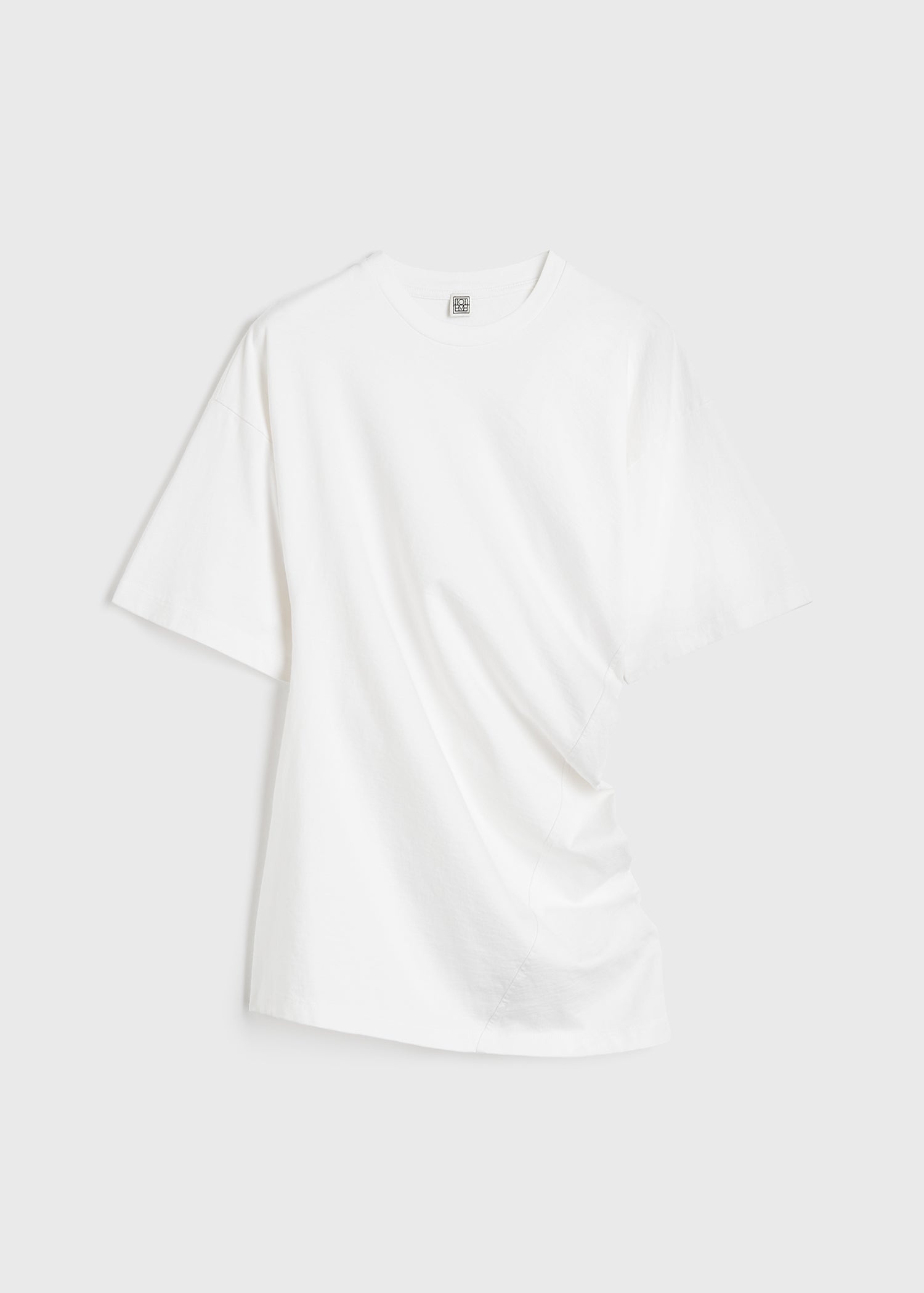 TOTEME T-shirt with a twisted construction as a reinterpretation of a classic wardrobe staple through a modern lens. It has relaxed short sleeves and a fitted waist made from comfortable organic-cotton jersey. Tuck it into trousers to work. Details & Fit - White - 100% organic cotton - 30°C Machine wash - Style number 243-WRT0342-FB0092 - The model is 180cm/511 tall and wears a size S - True to size, slim fit