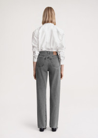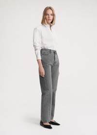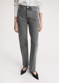 Building on TOTEME's Twisted seam denim, these jeans have a low-to-mid waistline and slightly wider and longer straight legs with some space at the thighs. They're made in Italy from mid-weight and rigid organic-cotton denim that's finished with five pockets, a leather monogram patch and a button fly. Wear them as intended for a relaxed fit or go down a size for a more fitted look. Details & Fit - Mid grey - Button fly, silver-tone hardware - Belt loops, five pockets - Monogram leather patch - 100% Organic cotton - 30°C Machine wash - Style number 241-WRB1214-FB0083 - Low-to-mid waist, long straight legs - The model is 177cm/59 tall and wears a size 26/34 - This style can run big, choose your usual size for a relaxed look or consider taking a size down