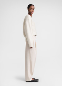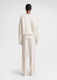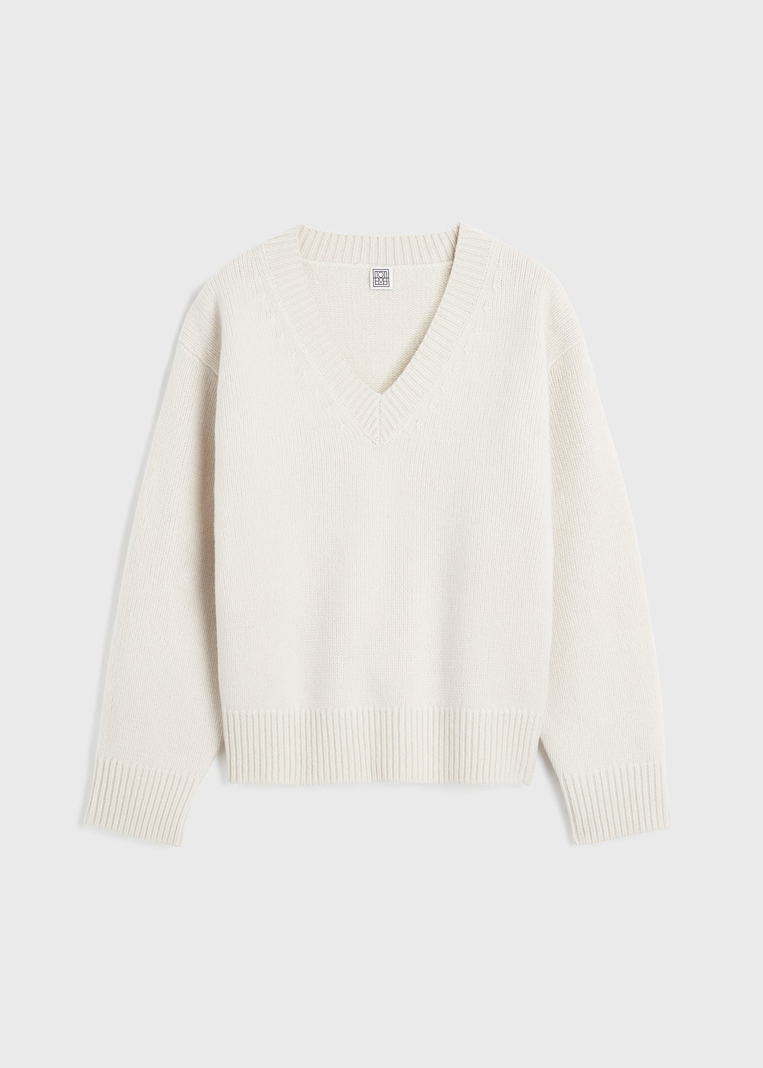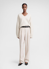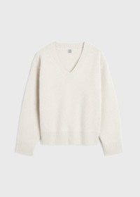 Warm TOTEME V-neck sweater knitted from soft wool with a touch of cashmere. It has a spacious silhouette with dropped shoulders, extra long rounded arms and subtle yet sculptural volume at the back. Tuck it into trousers for a meeting. Details & Fit - Snow - 90% Wool, 10% cashmere - Cool hand wash - Style number 241-WRT1034-YA0004 - The model is 180cm/511 tall and wears a size S - True to size, relaxed fit