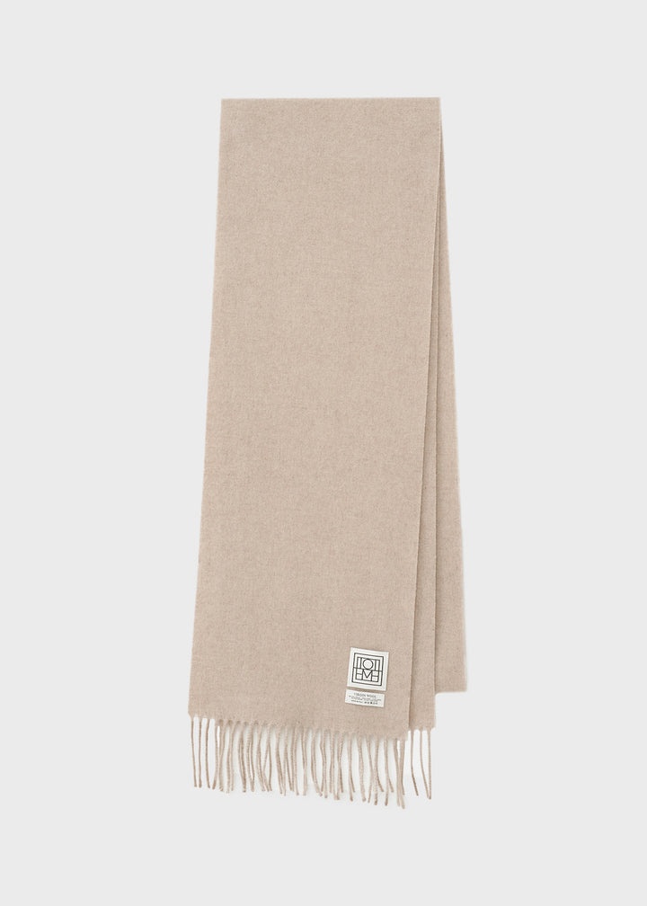 Classic TOTEME scarf made in Italy from responsibly sourced wool. It has a rectangular shape measuring 220x50cm with fringed edges and a monogram label. Wear it throughout winter over your favorite coat or jacket. Details & Fit - Light beige mélange - 100% Wool - Dry clean - Style number 214-881-807 - Length 220cm/87 - Width 50cm/20