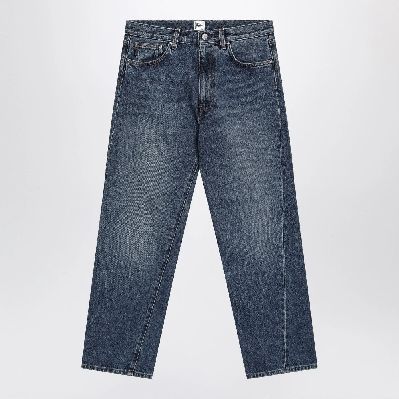 Washed blue cotton denim jeans by TOTEME with belt loops classic five pockets front zip-and-button closure and back logo patch.