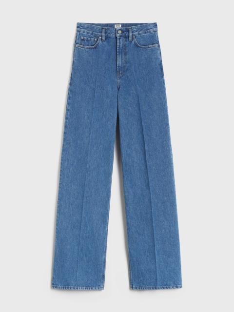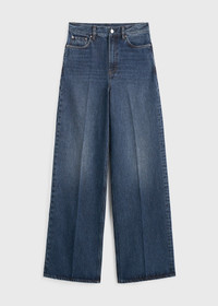 TOTEME jeans with a high waistline and extra-long, wide legs that are press-creased for definition. They are made in Italy from mid-weight organic-cotton denim with silver hardware and a zipper fly. Style them with flat loafers to showcase the modern silhouette. Details & Fit - Dark blue - Five pockets, belt loops, finished hem - Zipper fly - Leather patch - 100% cotton organic - 30°C machine wash - Style number 242-WRB2426-FB0045