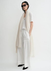 Designer's note: "These TOTEME Garderob trousers are cut with a spacious wide-leg silhouette that balances casual ease with sartorial precision. Made from a crisp linen-cotton blend with a semi-sheer finish, they capture the breezy mood of summer and are set with delicate drawstrings at the waist. Pair them with the coordinating shirt for an effortless warm-weather look." Details & Fit - White - Light, semi-sheer fabric - Elasticated drawstring waistband - Side and back pockets, embroidered monogram - 55% cotton, 45% linen - Cool hand wash - Style number 253-WRB0325-FB0458 - The model is 180cm/511 tall and wears a size 36 - True to size, dropped crotch and wide legs