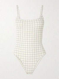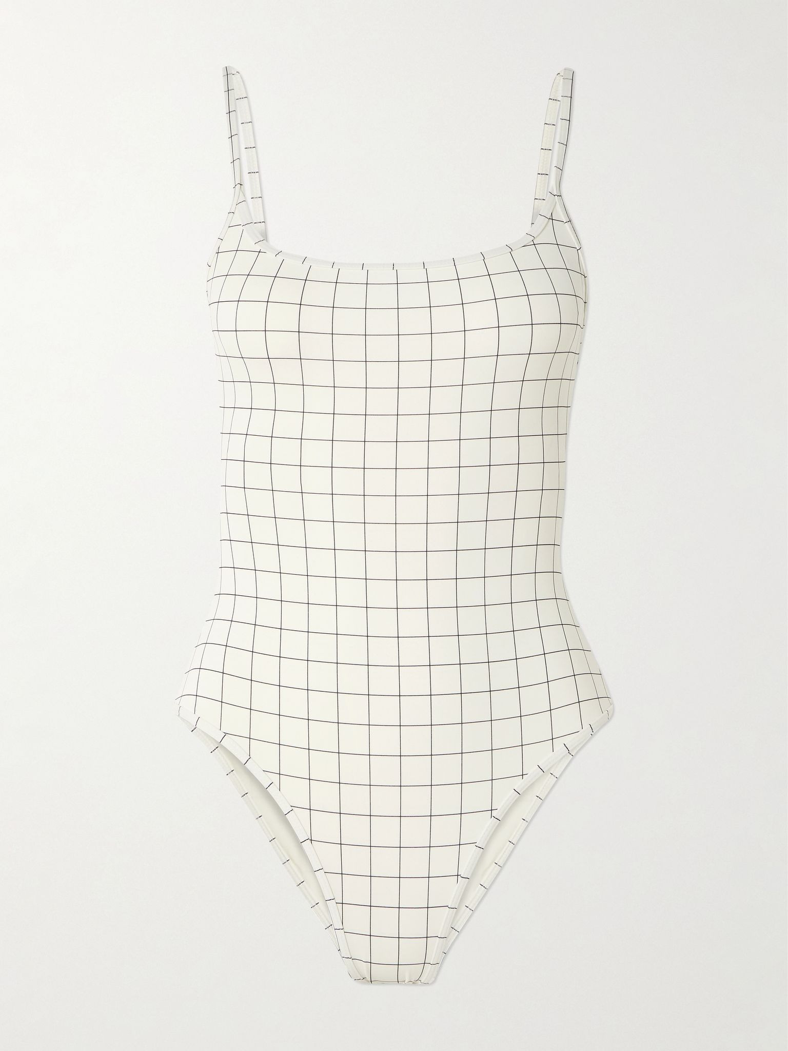 TOTEME's 'Windowpane' swimsuit is patterned with a thin-lined grid throughout. It rests on slim straps and turns to a dip in the back. Size & Fit - Fits true to size, take your normal size - Fully adjustable shoulder straps - Medium brief coverage - Model is 175cm/ 5'9", bra size 32C and is wearing a size XSmall Model measurements: - Bust: 80cm/ 31.5" - Waist: 60cm/ 24" - Hip: 89cm/ 35" Details & Care - White and black stretch-polyamide - Pull on - 43% recycled polyamide, 29% polyamide, 28% elastane - Machine wash or dry clean - Lotion, sunscreen, oil and chlorine can cause discoloration of this item; this is not a manufacturing defect. Please follow care instructions to keep your swimwear in the best condition