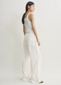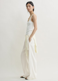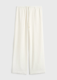 Drawstring trousers revisited for the season in a fluid fabric featuring raised stripes that evoke an artisanal mood. Woven from a viscose blend with a hint of linen, they have a drawstring waist and wide legs complete with side and back pockets. Details - Meringue - Drawstring waist - Side and back pockets - 96% viscose, 4% linen - Dry clean - Style number 262-WRB0489-FB0192 Fit information - The model is 180cm/5’11” tall and wears a size 36 - Relaxed fit Origin & Certificates - Made in Portugal - Manufacturer: Canto Novo - Texteis, Lda - Material woven in China; dyed in China
