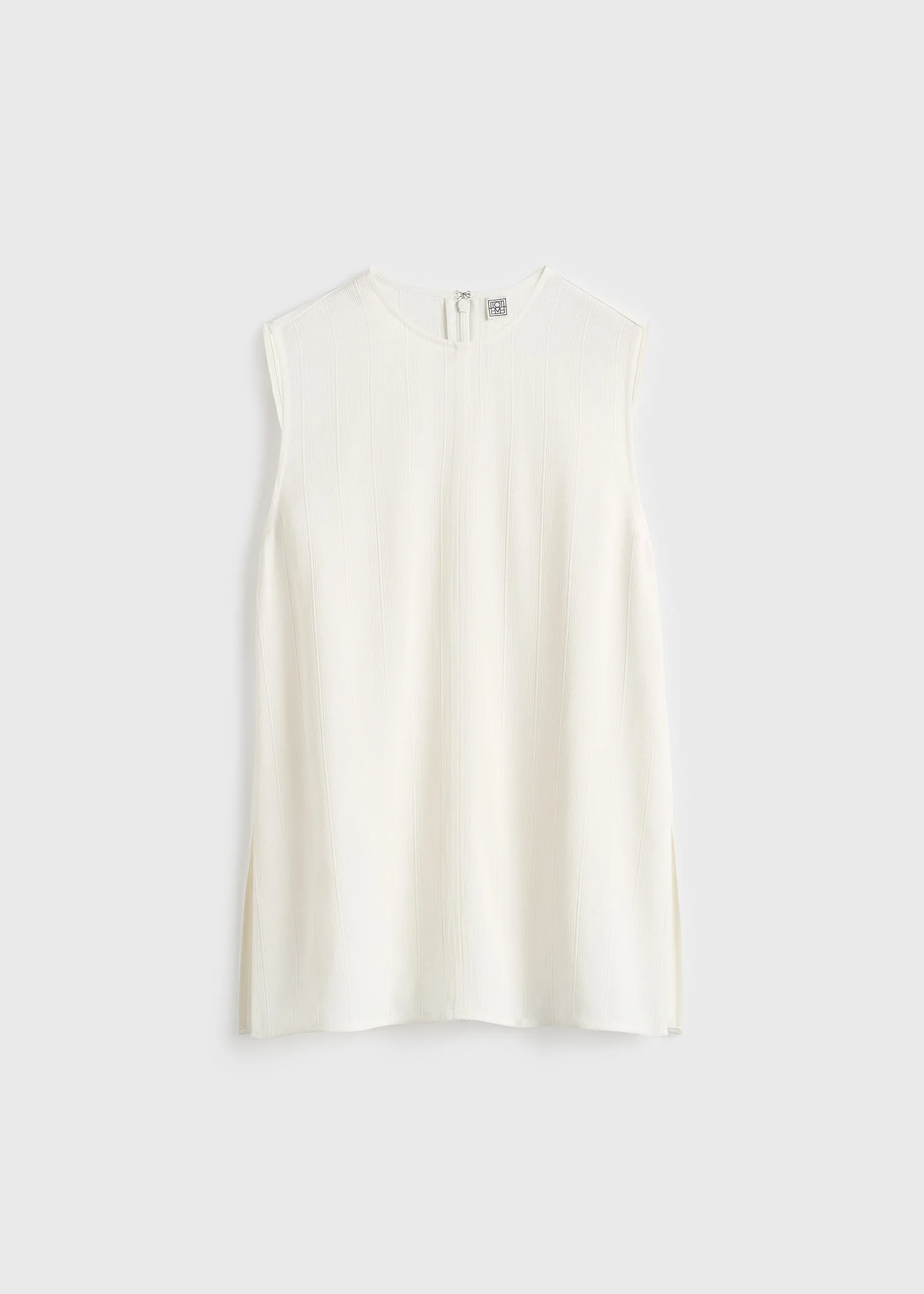 Tank crafted with a touch of linen, outlined with a tonal stripe for relaxed tactility. Its straight cut and classic sleeveless silhouette falls below the hip. Details - Meringue - 96% viscose, 4% linen - Dry clean - Style number 262-WRT0871-FB0192 Fit information - The model is 180cm/5'11” tall and wears a size 36 - Relaxed fit Origin & Certificates - Made in Portugal - Manufacturer: Priority Season - Material woven in China; dyed in China