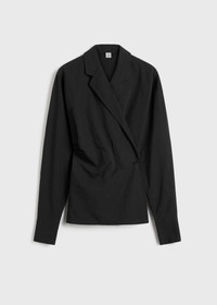 TOTEME wrap blouse conceived with rounded batwing sleeves tempered by a slim, buttoned waistline, creating sculptural volumes. Complete a monochrome look with white trousers. Details & Fit - Black - Batwing sleeves - One-button wrap waist - Buttoned cuffs - Mid-weight fabric with subtle texture - 74% cotton organic, 26% linen - Dry clean - Style number 253-WRT0543-FB0425 - The model is 176cm/59 tall and wears a size S - True to size, fastens at the waist with a slim fit