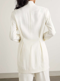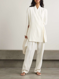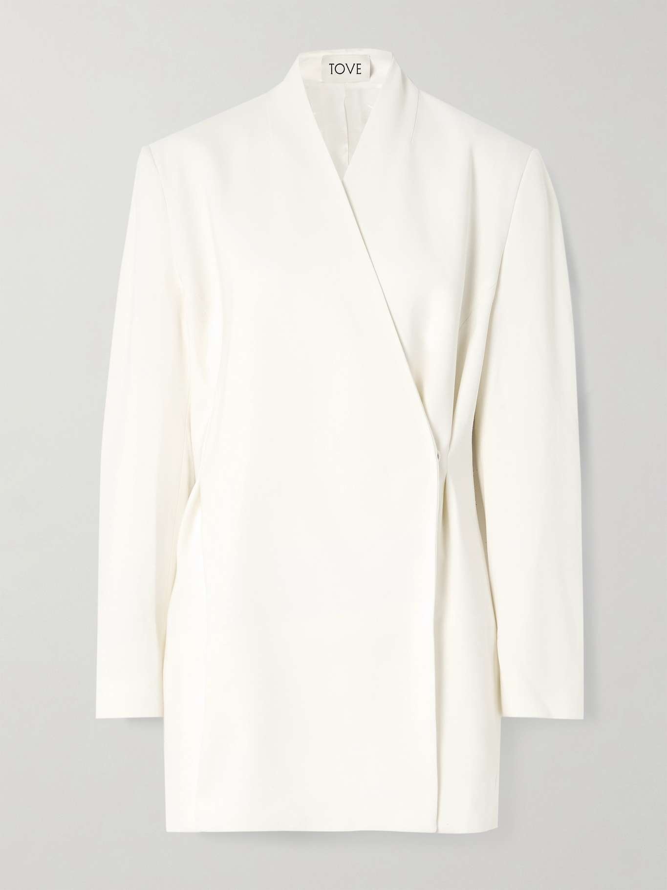 EDITORS'NOTES TOVE is named after the Danish word for strength and beauty, which perfectly encapsulate the brand. Tailored from crepe, this 'Aldar' blazer has a wrap front that defines your waist and a satin lining to ensure effortless layering. SIZE & FIT Model measurements: - Fits true to size, take your normal size - Designed for a slim fit - Internal shoulder pads - Mid-weight, non-stretchy fabric - Model is 175cm/ 5'9" and is wearing a FR 36 - Bust: 81cm/ 32" - Waist: 64cm/ 25" - Hip: 89cm/ 35" DETAILS & CARE - Ivory crepe - Concealed snap fastening at front - 55% viscose, 45% virgin wool; lining: 53% viscose, 47% ECOVERO™ viscose - Dry clean