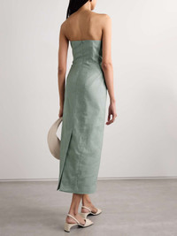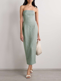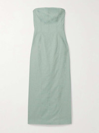 EDITORS'NOTES TOVE's co-founders Camille Perry and Holly Wright are inspired by the real women in their lives and what they'd want to wear when designing the brand's clothing. Meant to closely skim your frame, this 'Alex' midi dress is cut from smooth wool-blend - look closely and you'll notice it's woven with a combination of mint and sand threads - and has a strapless neckline. The back split ensures it's easy to move. SIZE & FIT Model measurements: - Fits true to size, take your normal size - Those with a curvy figure may wish to take the next size up - Designed for a slim fit - Lightweight, non-stretchy fabric - Model is 180cm/ 5'11" and is wearing a FR 36 - Bust: 76cm/ 30" - Waist: 60cm/ 23.5" - Hip: 88cm/ 34.5" DETAILS & CARE - Mint and sand wool-blend - Concealed hook and zip fastening at back - 67% wool, 31% linen, 2% silk; lining: 65% polyester, 35% cotton - Dry clean