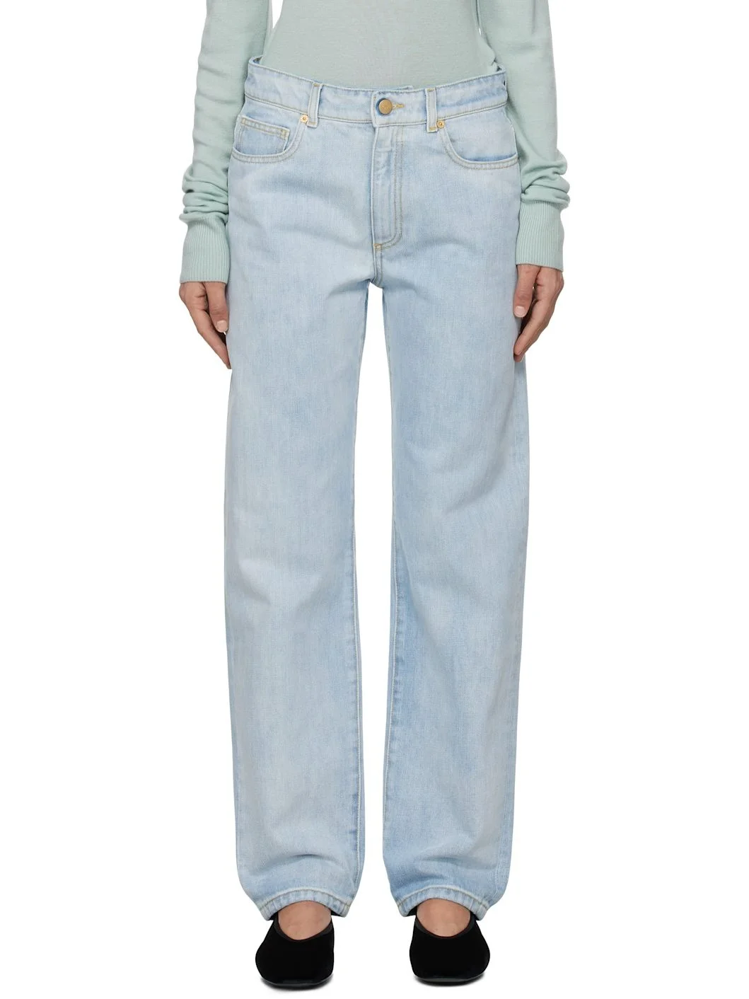 Non-stretch recycled cotton-blend denim jeans. · Mid-rise · Belt loops · Five-pocket styling · Zip fly · Leather logo patch at back waistband · Contrast stitching in yellow Supplier color: Light blue 46% cotton, 46% recycled cotton, 8% recycled polyester. Made in Italy 251933F069000