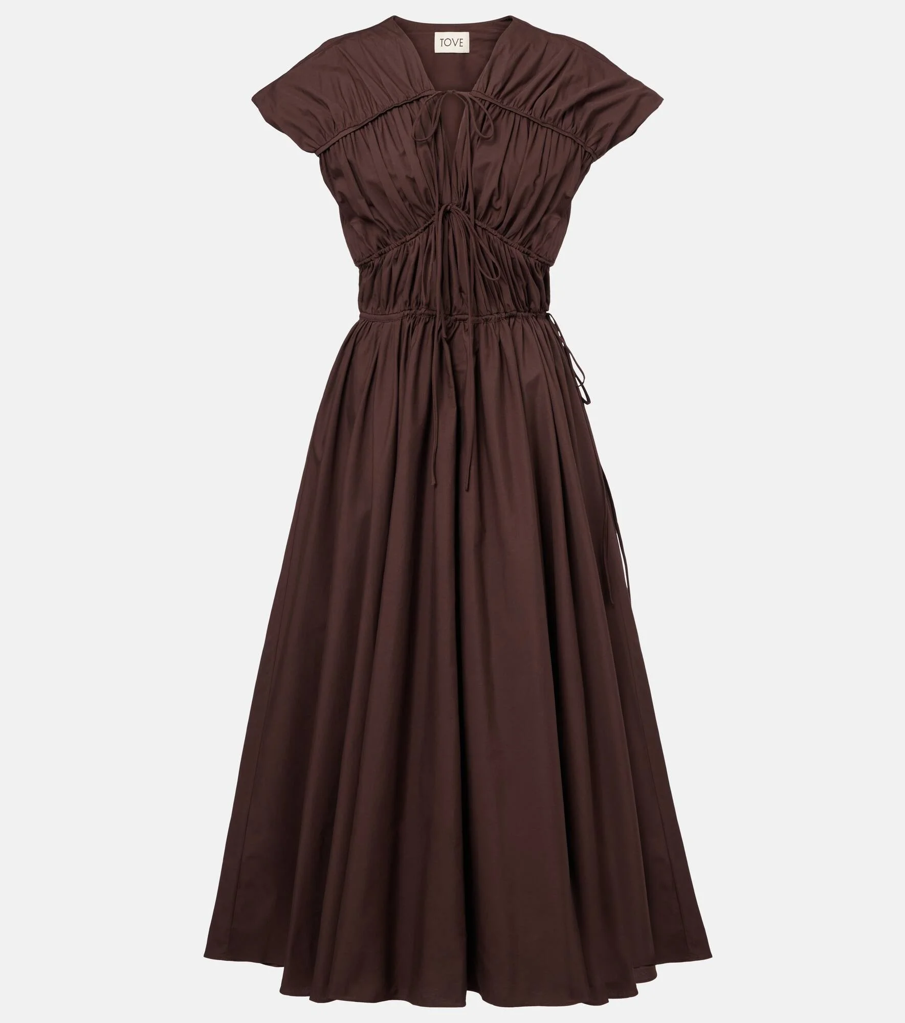 The Ceres midi dress from Tove is fully made from pure cotton. The design has a beautifully gathered bodice that punctuates the plunging neckline with delicate, romantic self-tie bows. Product Details - Material: 100% cotton - Care instructions: machine wash at 40 degrees - Made in Portugal - Designer color name: Chocolate - Item color: brown - Item number: P01058108 Size & Fit - True to size - Loose fit, drawstring waist - Non-stretchy fabric - The model seen in the picture is 178cm-5'10" and wearing a size FR 36