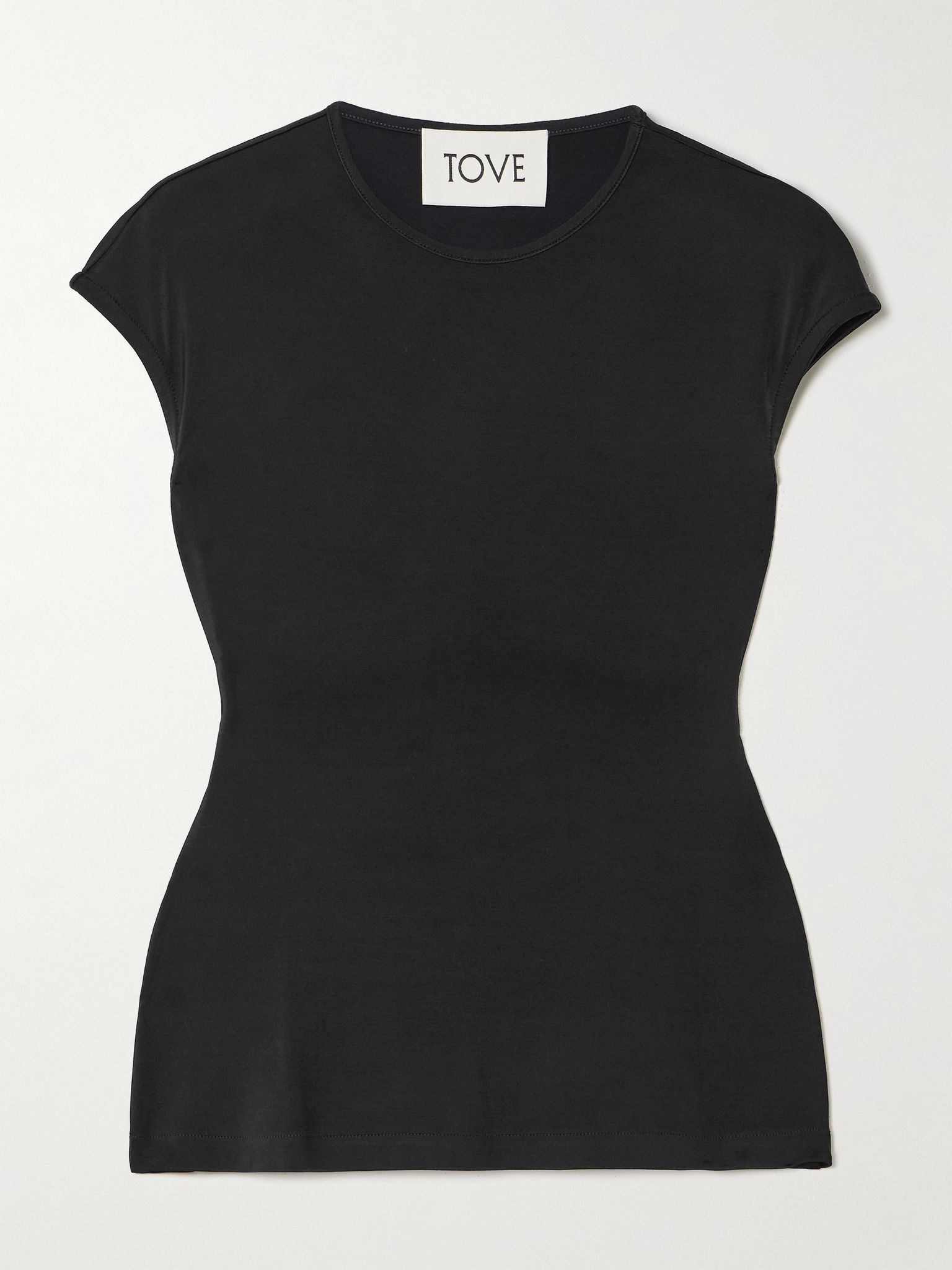 TOVE's 'Deca' top is made from lustrous stretch-jersey that feels beautifully smooth. It's designed for a slim fit and has a classic crew neckline framed by cap sleeves. Size & Fit - Fits true to size, take your normal size - Designed for a very close fit - Mid-weight, stretchy fabric - Model is 177cm/ 5'10" and is wearing a FR 36 Details & Care - Black stretch-jersey - Slips on - 95% viscose, 5% elastane