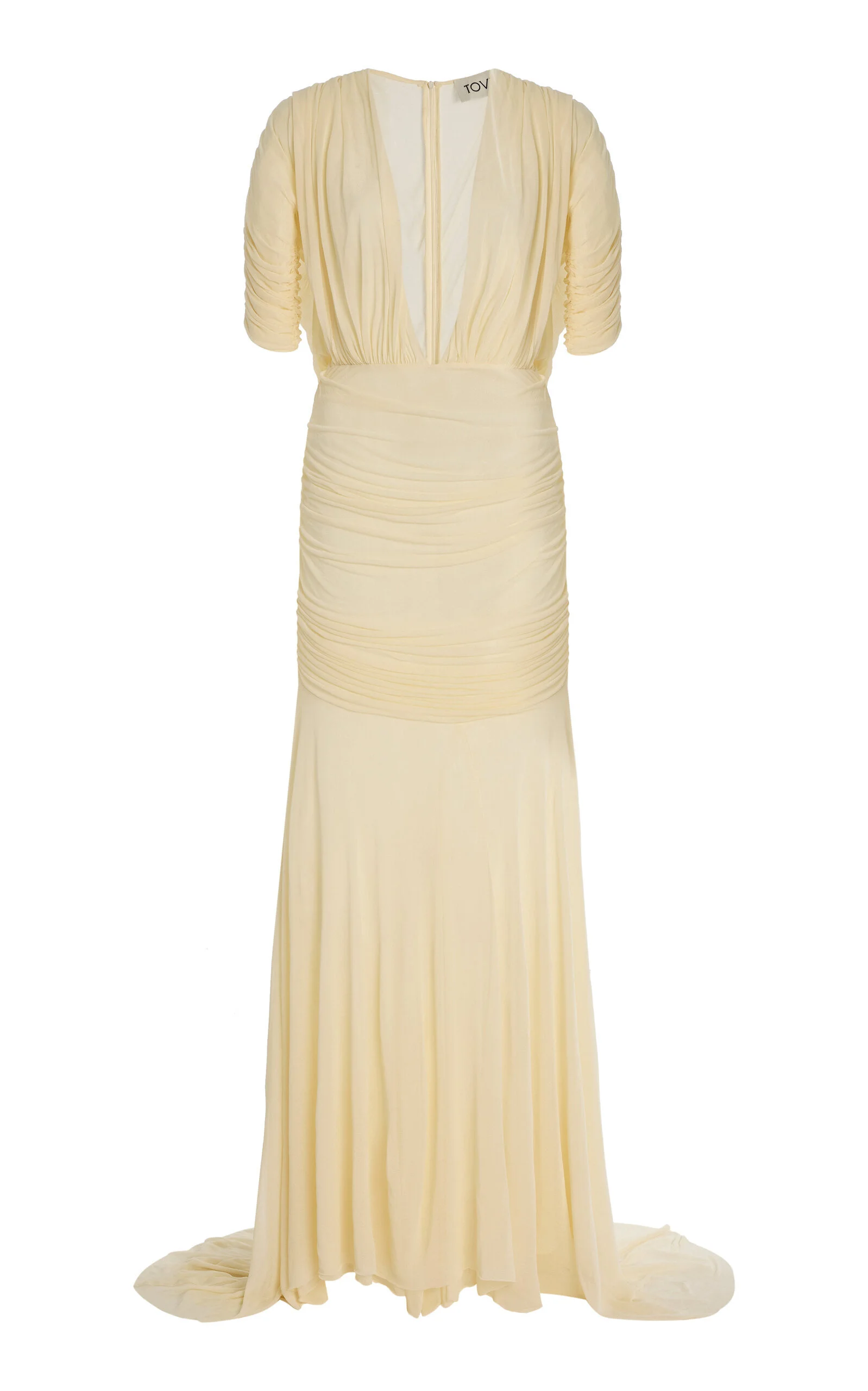 Expertly crafted with luxury fabrics, every Tove collection is thoughtfully made to last through seasons and styles. Co-founders Camille Perry and Holly Wright design classics for the modern woman, and this collection promises clean lines and feminine silhouettes. The 'Devi' dress is meticulously gathered and layered to create a striking, overtly feminine silhouette. A dramatic interplay of translucency and opacity, the dress features a deep V-neckline and is crafted from lightweight, fluid viscose jersey. PRODUCT DETAILS - Pre-Fall '25 - Concealed zip fastening along back - Composition: 100% Viscose - Designer color: Lemon - Dry clean - Imported SIZE & FIT - Designed for a slim fit